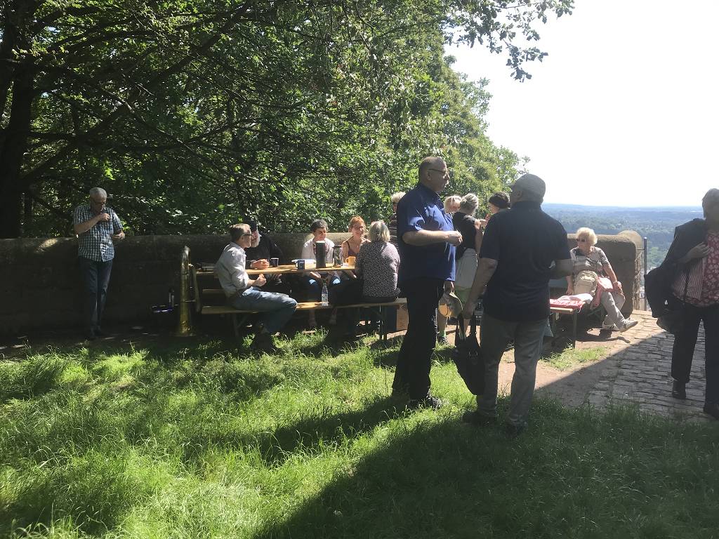 Im Anschluß daran wanderten die Teilnehmer auf einem schmalen Waldweg hinauf zur Friedrichshöhe und von dort weiter bis zum geöffneten Bismarckturm, wo die Gruppe von Vereinsmitglied Joe Walz mit einem Gedicht und musikalischer Untermalung empfangen wurde. Nach einer kurzen Erfrischung bildete der „Weitblick vom Bismarckturm“ den krönenden Abschluß einer rundum gelungenen Veranstaltung, die Lust auf mehr macht.