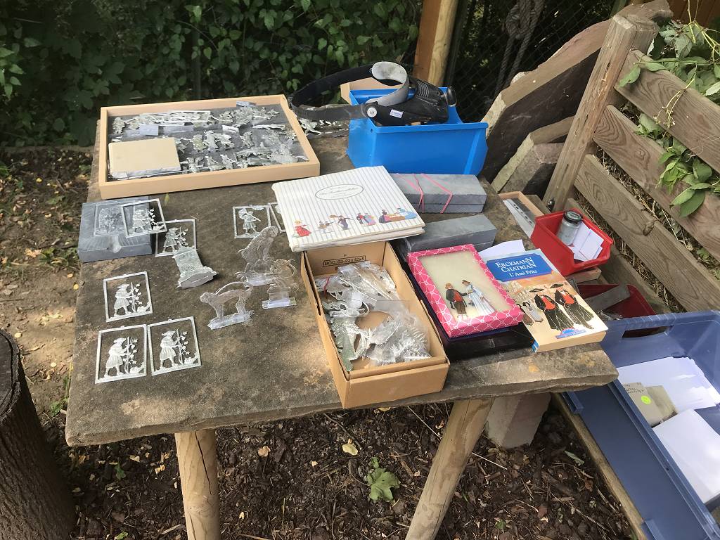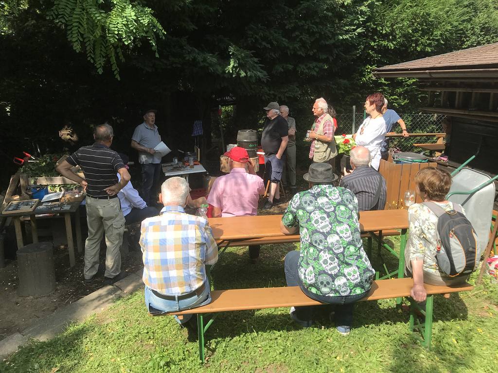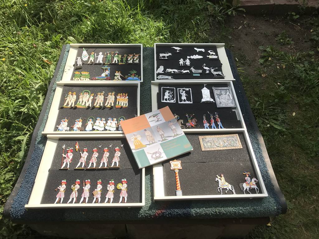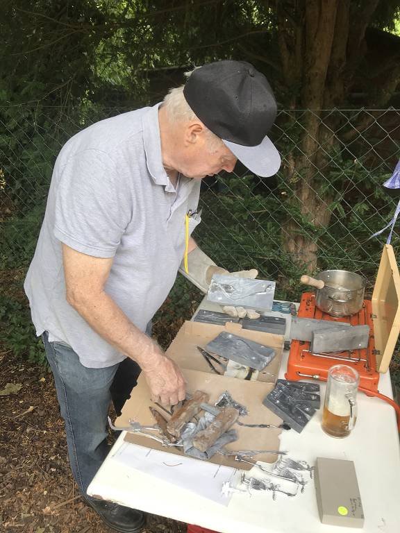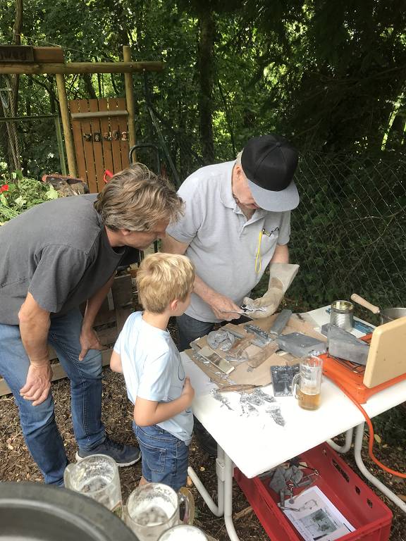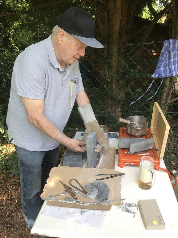 Ein Hingucker waren sie allemal, die Zinnfiguren des bekannten Ettlinger Zinngießers Dieter Schwarz, der sein Schaffen beim Sommer-Frühschoppen der Robbergfreunde am Sonntag, 2. Juli präsentierte. Vor den Augen der Gäste entstanden Miniaturen aus Zinn, die teilweise Kindheitserinnerungen weckten. Dabei geht das Spektrum natürlich weit über die hinlänglich bekannten Zinnsoldaten hinaus. Personen, Tiere, Pflanzen, Landschaften bis hin zu 3D-Modellen nehmen in teils filigran ausgearbeiteten Formen Gestalt an. Ist das nun Handwerk, bei dem Präzision und Erfahrung beim Gießen der Figuren gefragt ist oder Kunst, deren künstlerische Aspekte spätestens bei der Bemalung und der Ausarbeitung der Formen zum Tragen kommen? Dieter Schwarz vereint beide Welten und begeisterte die Teilnehmer des Frühschoppens zunächst mit einem Vortrag über die Geschichte der Zinnfiguren und seinen Weg zu diesem Beruf, anschließend mit Live-Vorführungen, bei denen das 250 °C heiße Zinn in die gewünschte Gestalt wechselte. Darunter auch eine Form für das Weiße Häusle am Robberg, die Dieter Schwarz eigens für dessen Sanierung im Jahr 1987 anfertigte.
