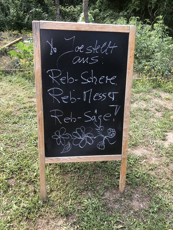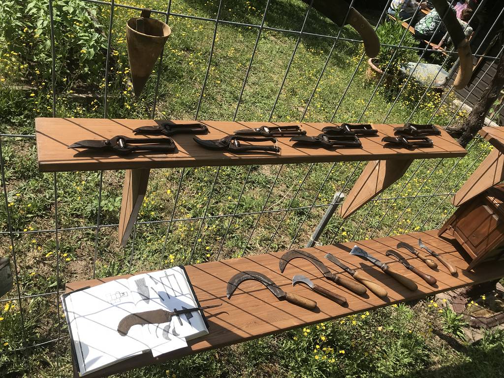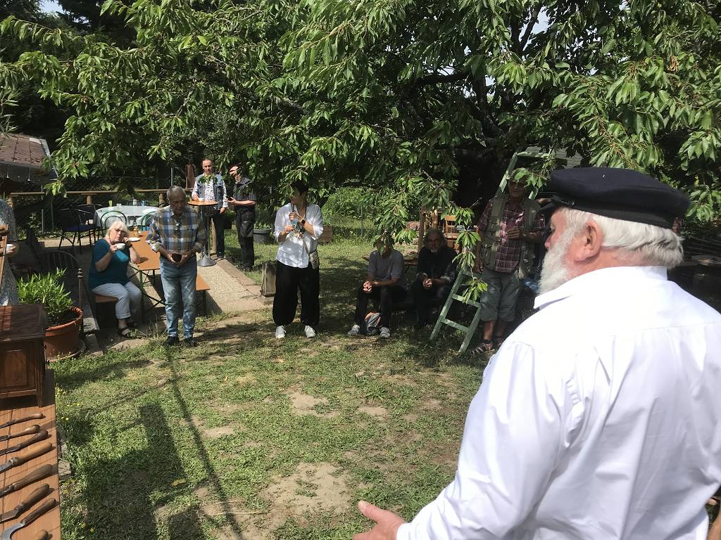 Auch die Bauzaungalerie war bei diesem Frühschoppen wieder präsent. „Historische Rebmesser von der Römerzeit bis zur Gegenwart“ war das Motto, unter dem Joe Walz Gerätschaften zur Bearbeitung von Rebstöcken präsentierte, darunter Rebmesser, Rebscheren, Rebsägen und Schälwerkzeuge zur Bearbeitung der Rinde. Aus einem Buch über die Römerzeit in Ettlingen ließ sich sogar der Einsatz eines der Rebmesser im Bereich Ettlingen nachweisen. Natürlich ließ es sich Joe Walz nicht nehmen, die einzelnen Gerätschaften detailliert vorzustellen und anschließend noch ein Gedicht aus seinem reichhaltigen Repertoire zum Besten zu geben.
