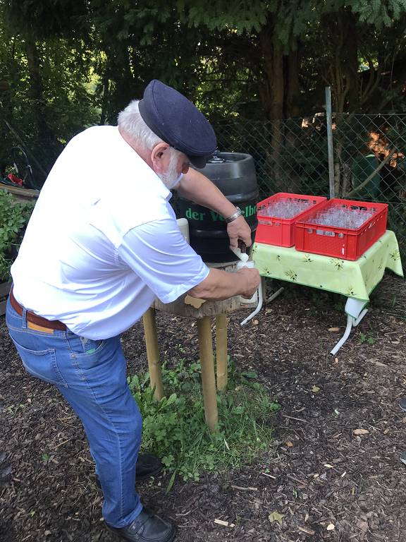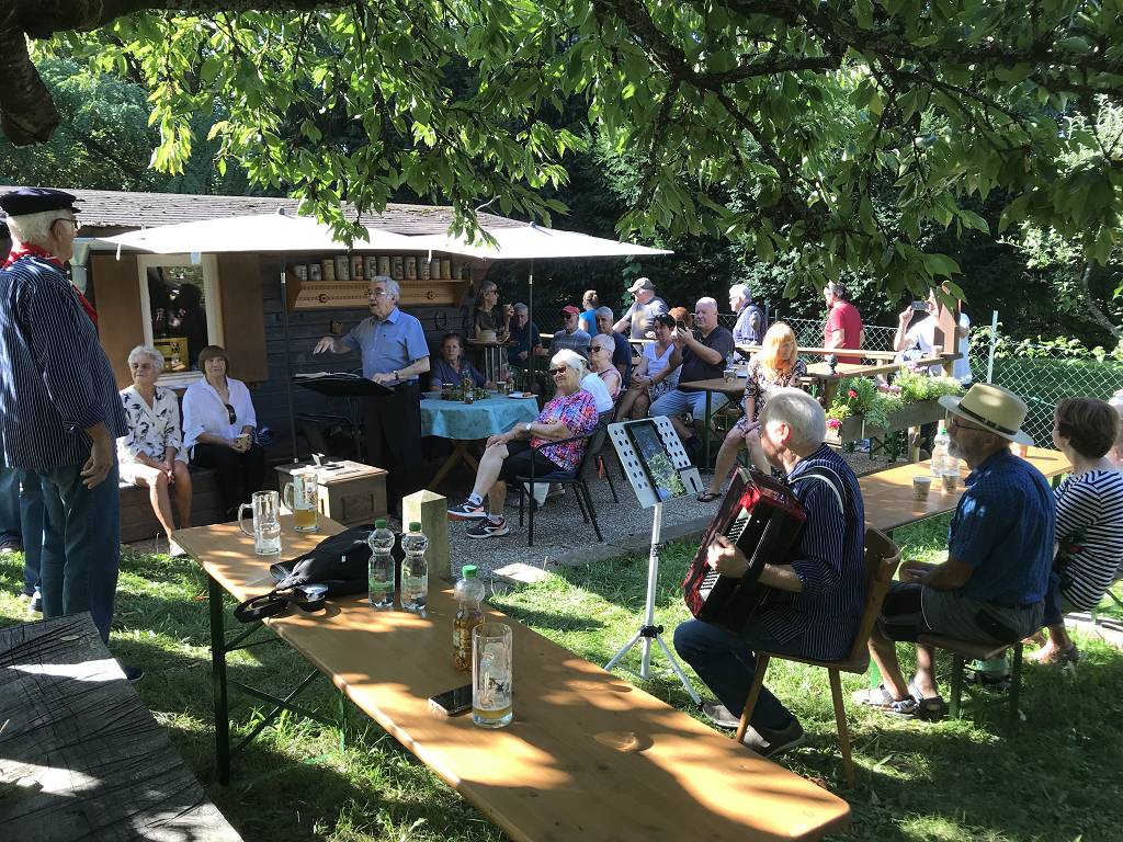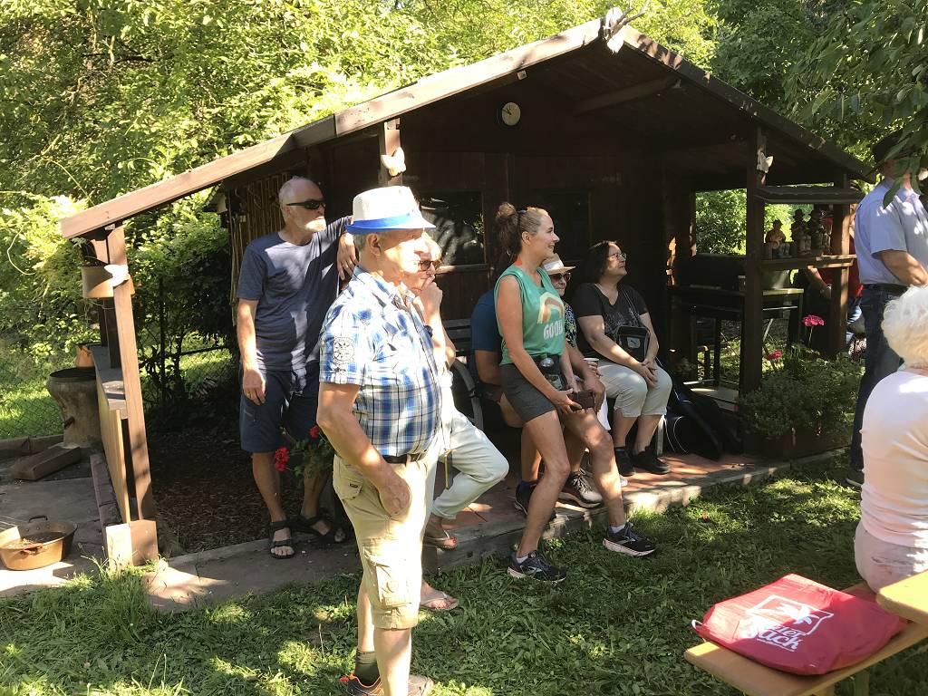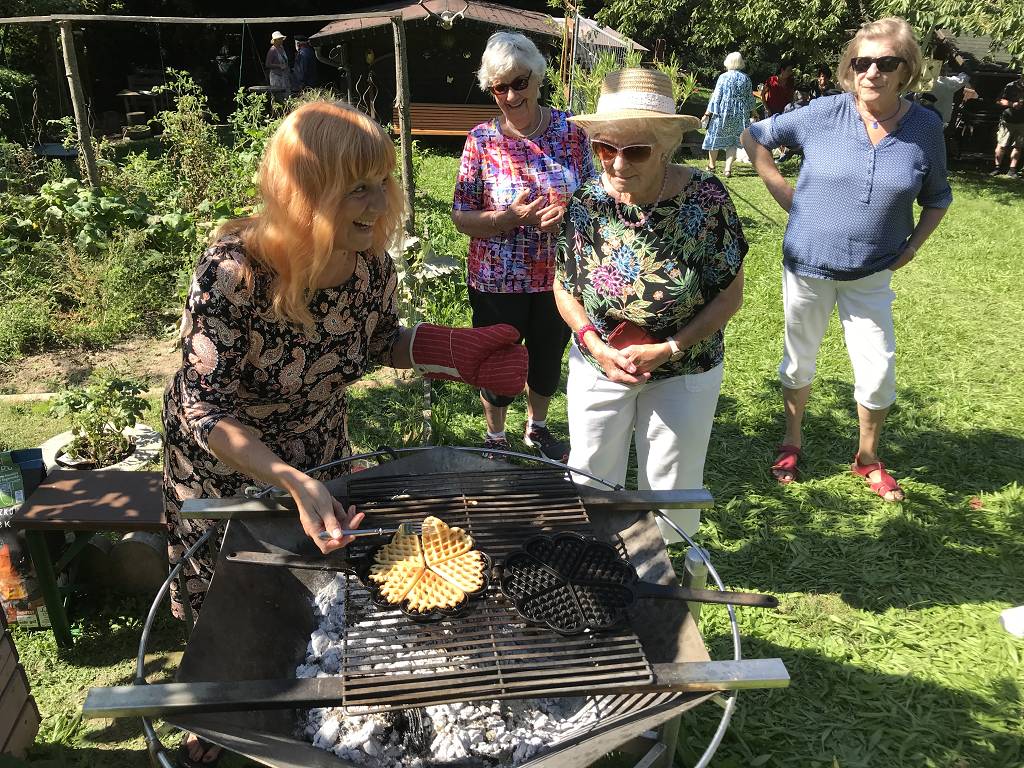 Dass anschließend doch noch etwas Oktoberfest-Stimmung aufkam, ist nicht zuletzt dem Frühstück mit Weißwürsten, Brezeln, Obazda und einem frisch gezapften, kühlen Bier zu verdanken. Aufgrund der hohen Besucherzahl waren bald die Sitzplätze rar, insbesondere die Schattenplätze. Nach einer ersten Stärkung führte uns Joe Walz mit seinen Ausführungen in eine Zeit zurück, als Waffeleisen noch keinen Stecker bzw. Stromanschluss besaßen. Die erforderlichen Waffeleisen konnten entweder in die Ofenringe eines Holz- oder Kohleofens eingesetzt werden, oder sie waren mit langen Griffen versehen, um sie direkt auf die Feuerstelle zu setzen. Zahlreiche Exponate aus dem Fundus von Joe Walz an der Bauzaungalerie machten seine Erzählungen erlebbar. Und zur Demonstration, dass dies früher auch funktionierte, wurden mit einem historischen Waffeleisen frische Waffeln auf der Holzkohlenglut gebacken, die reißenden Absatz fanden.