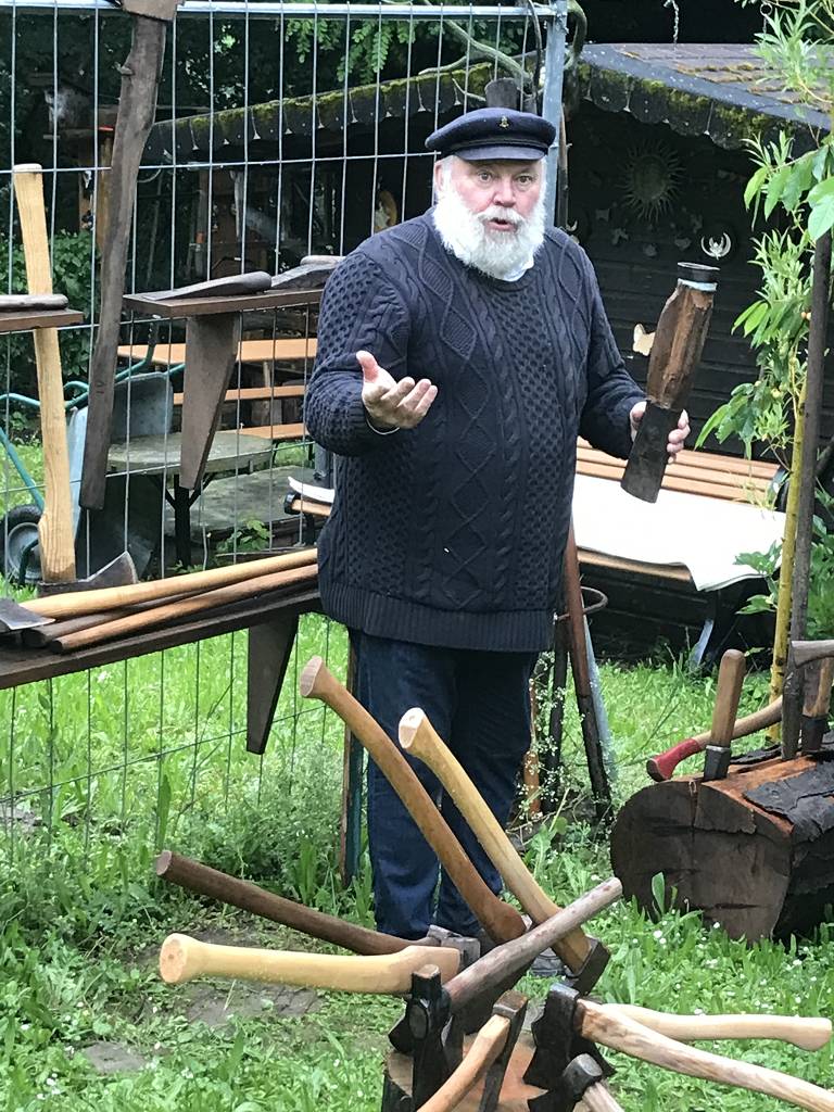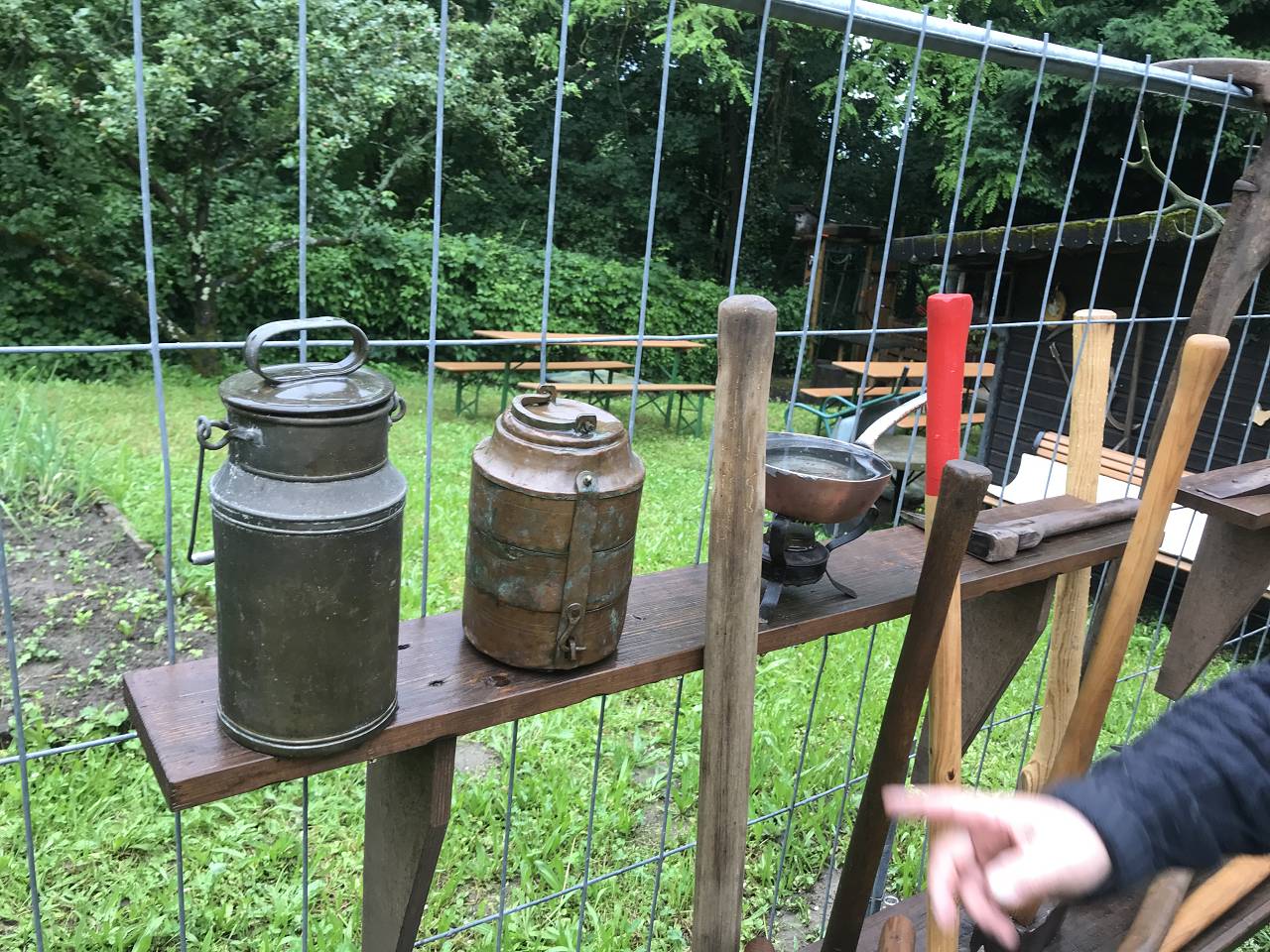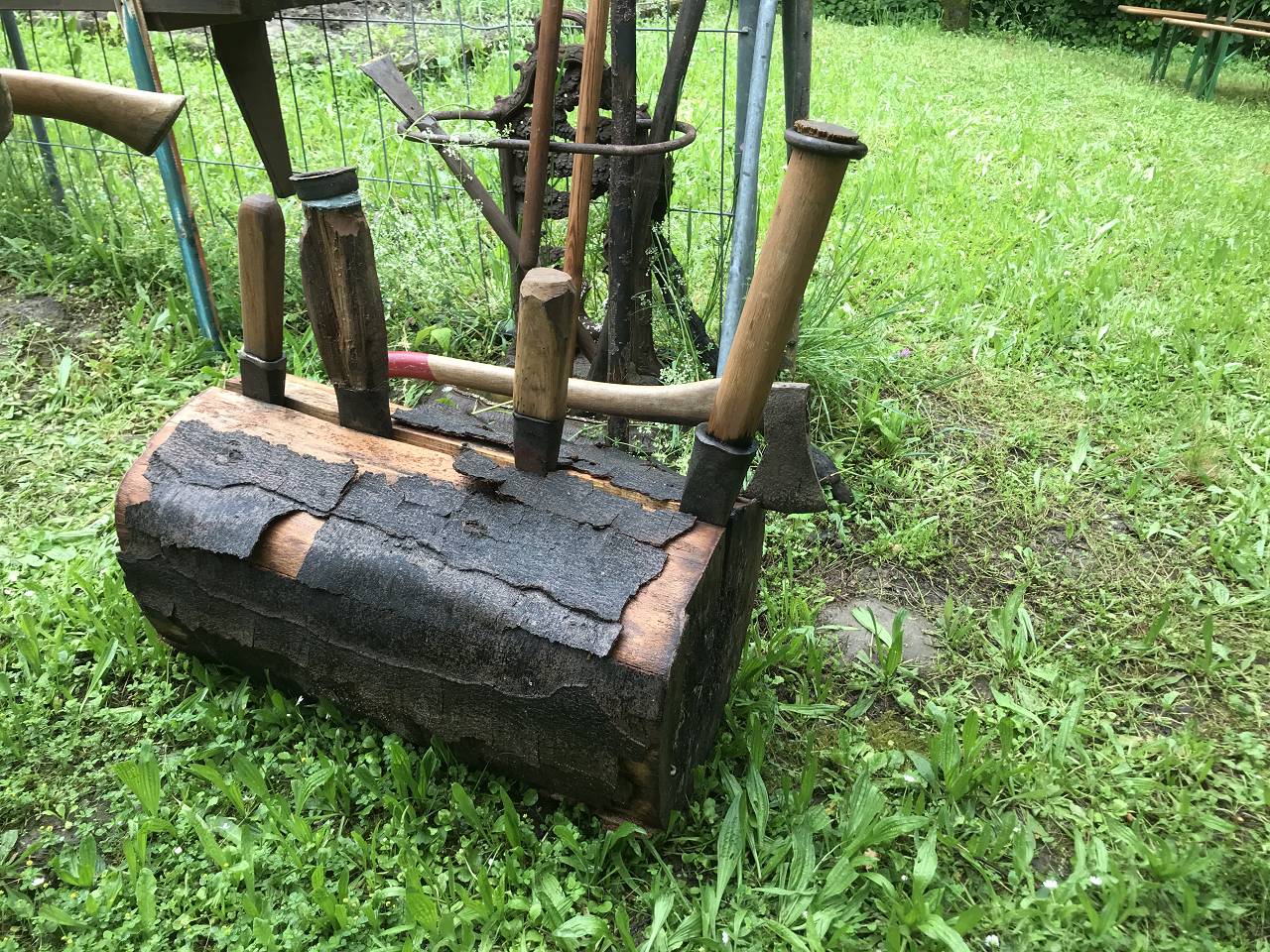„Holzmacherwerkzeug und -gerätschaften“ hieß das Motto der Veranstaltung. Und so wie früher die Holzmacher bei Wind und Wetter zur Arbeit gingen, haben sich die Besucher nicht beirren lassen, sich auf dem Veranstaltungsgrundstück einzufinden und auch die Exponate an der Bauzaun-Galerie zu bestaunen. Aus seinem schier unendlichen Fundus hat Vereinsmitglied Joe Walz wieder interessante und sehenswerte Gerätschaften platziert und natürlich über deren Funktionsweise ausführlich informiert. Am Sägebock durfte dann später auch selbst Hand angelegt werden. Und wer die Last des Holzmachens in früheren Zeiten selbst auf dem Rücken spüren wollte, der durfte sich auch gerne die Kracks, das historische Holztragegestell, aufsetzen lassen.