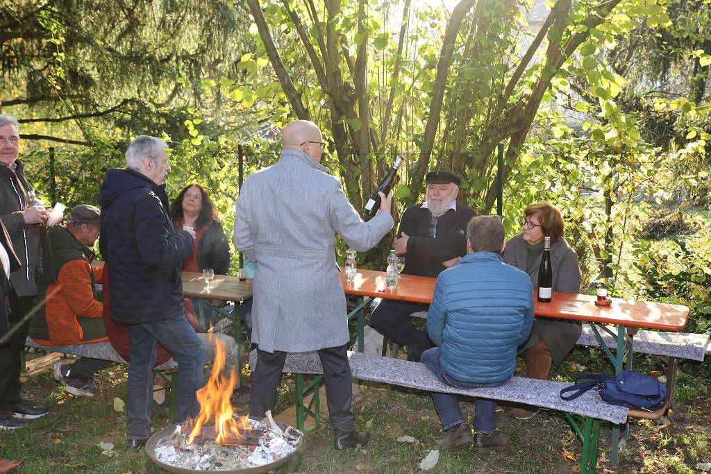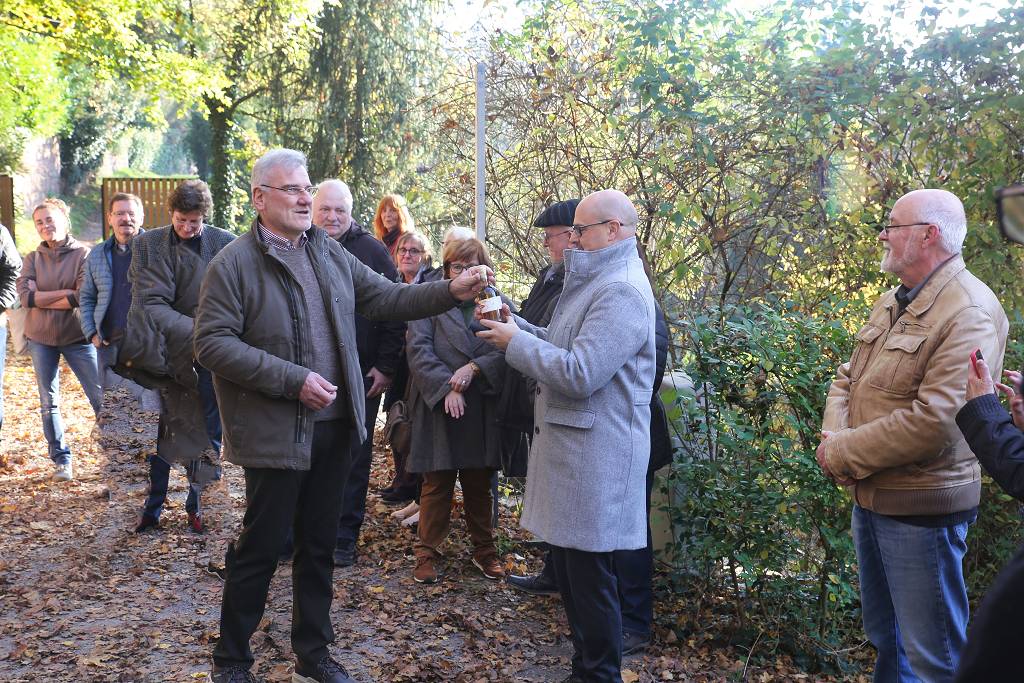 Oberbürgermeister Johannes Arnold betonte in einer kleinen Ansprache, dass ihm der Erhalt des Robbergs als kulturhistorische Landschaft ein Anliegen sei und er die Bestrebungen des Vereins sehr zu schätzen wisse. Insbesondere auch aufgrund der mühsamen Bewirtschaftung der Grundstücke. Insofern freue er sich, das Wasserreservoir nach der Sanierung nun wieder an den Verein übergeben zu können. Für die Stadt Ettlingen erfolgte die Maßnahme allerdings in einem noch größeren Kontext. Insgesamt vier solcher historischer Trinkwasserbehälter existieren auf der Gemarkung Ettlingen, die allesamt sanierungsbedürftig waren. Bei einer Gesamtinvestition von über 800.000€ überlegt man sich schon zweimal, ob die Maßnahme angegangen werden soll. Aber da jede Privatperson verpflichtet sei, denkmalgeschützte Gebäude zu erhalten, fand sich auch im Gemeinderat eine Mehrheit, die historischen, öffentlichen Gebäude nicht verkommen zu lassen. Auch Herr Arnold lobte die geschmackvolle, historische Umsetzung durch die ausführenden Betriebe und dankte den Robbergfreunden für deren jahrelanges Ausharren.