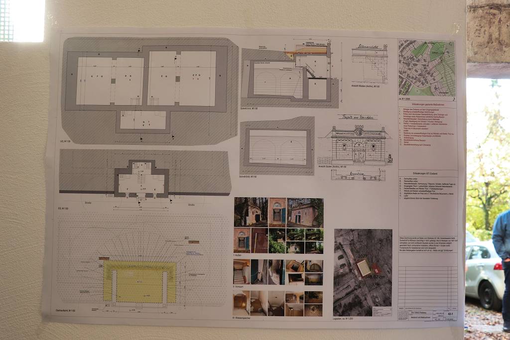 Nach der Übergabe nutzen die Gäste die Gelegenheit, das Wasserreservoir von innen zu besichtigen, auch wenn letztendlich nur ein kleiner Vorraum zugänglich ist. Die beiden Wasserkammern – inzwischen natürlich leer – mit einem Volumen von 500m³ sind durch Gitter abgedeckt, ebenso der Pumpenraum unterhalb des Vorraumes. Im Vorfeld der Einweihung konnte der Verein noch einige Einrichtungsgegenstände beschaffen und aufbauen, so dass die ehemalige und zukünftige Nutzung wieder erkennbar wird. Das Architekturbüro Planfabrik SPS stellte noch Pläne zur Verfügung, die im Wasserreservoir ausgehängt wurden und die das Gesamtbauwerk und die durchgeführten Maßnahmen erlebbar machten.