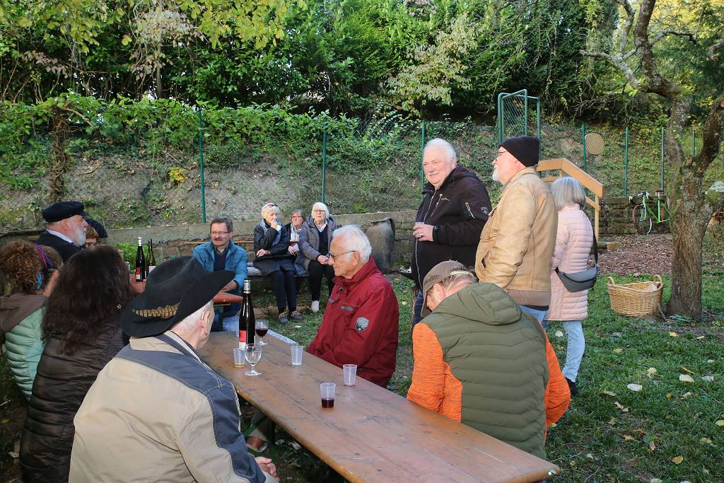 Zum Abschluss der Veranstaltung luden die Robbergfreunde die Festgemeinde noch in die „Robburg“ auf dem Grundstück von Joe Walz unterhalb des Parkplatzes ein. Wie im Jahre 1901, bei der erstmaligen Einweihung des „Robberg-Behälters“, wurden ebenfalls – dem Ereignis angemessen – Brezel und Wein gereicht. Als kleine Besonderheit wurden dabei echter „Robberg-Wein“ und sogar ein „Robberg-Weinbrand“ ausgeschenkt. Und mancher Gast kam dabei ins Grübeln, wie wohl die Sage um den geschrumpften Riesen in Ettlingen entstanden sein möge. Am wohlschmeckenden Rebensaft, den die Hobby-Winzer vom Robberg präsentierten, kann es sicherlich nicht gelegen haben. Daher nutzten viele der Gäste die Gelegenheit, die Erzeugnisse vom Robberg zu verkosten und natürlich auch darüber zu fachsimpeln. Und so klang die gelungene Einweihungsfeier mit der untergehenden Herbstsonne aus und die Robbergfreunde fanden nach jahrelanger Abwesenheit endlich wieder ein Zuhause.